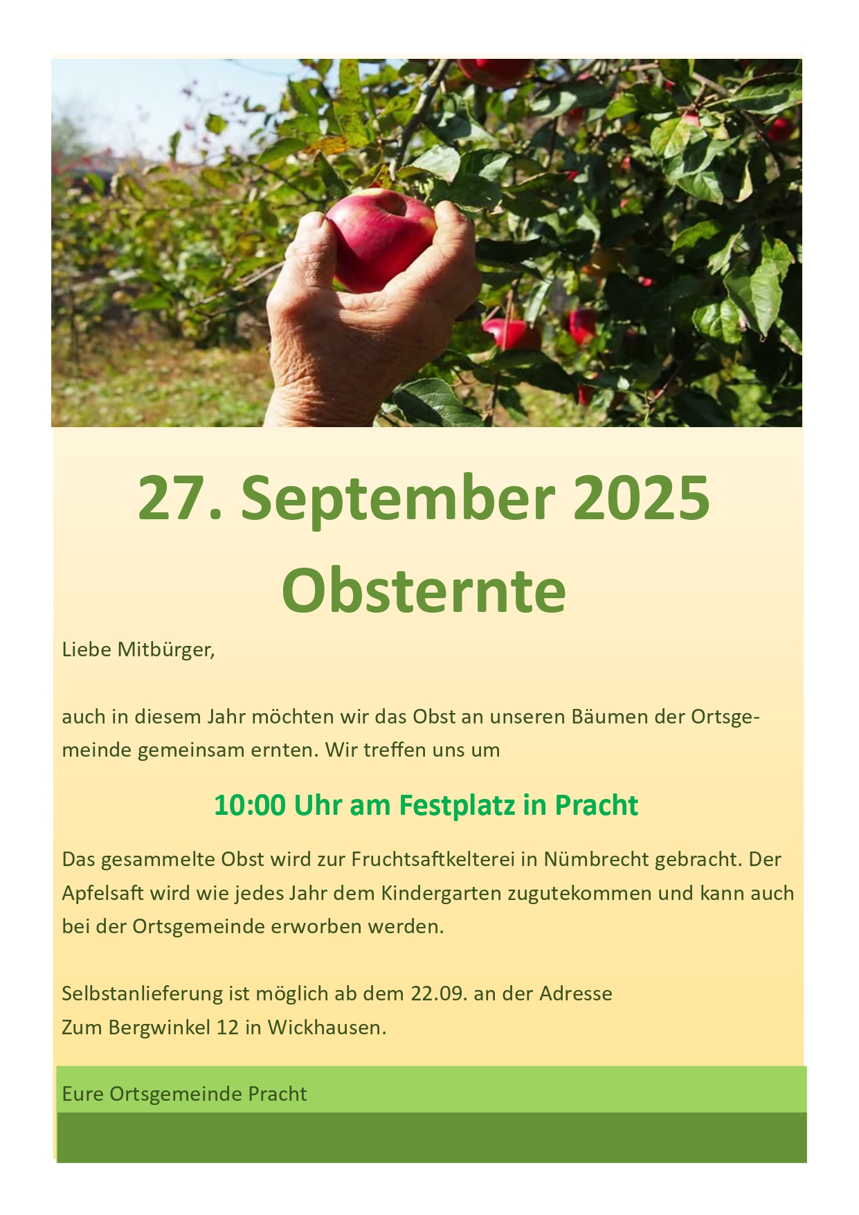 Die Ortsgemeinde Pracht lädt alle Mitbürgerinnen und Mitbürger am Samstag, 27. September 2025, um 10 Uhr zur Obsternte auf den Festplatz ein. Gemeinsam wird das Obst von den gemeindeeigenen Bäumen gesammelt und anschließend zur Fruchtsaftkelterei in Nümbrecht gebracht. Der daraus gewonnene Apfelsaft kommt wie in den vergangenen Jahren dem Kindergarten zugute und kann zudem über die Ortsgemeinde erworben werden.